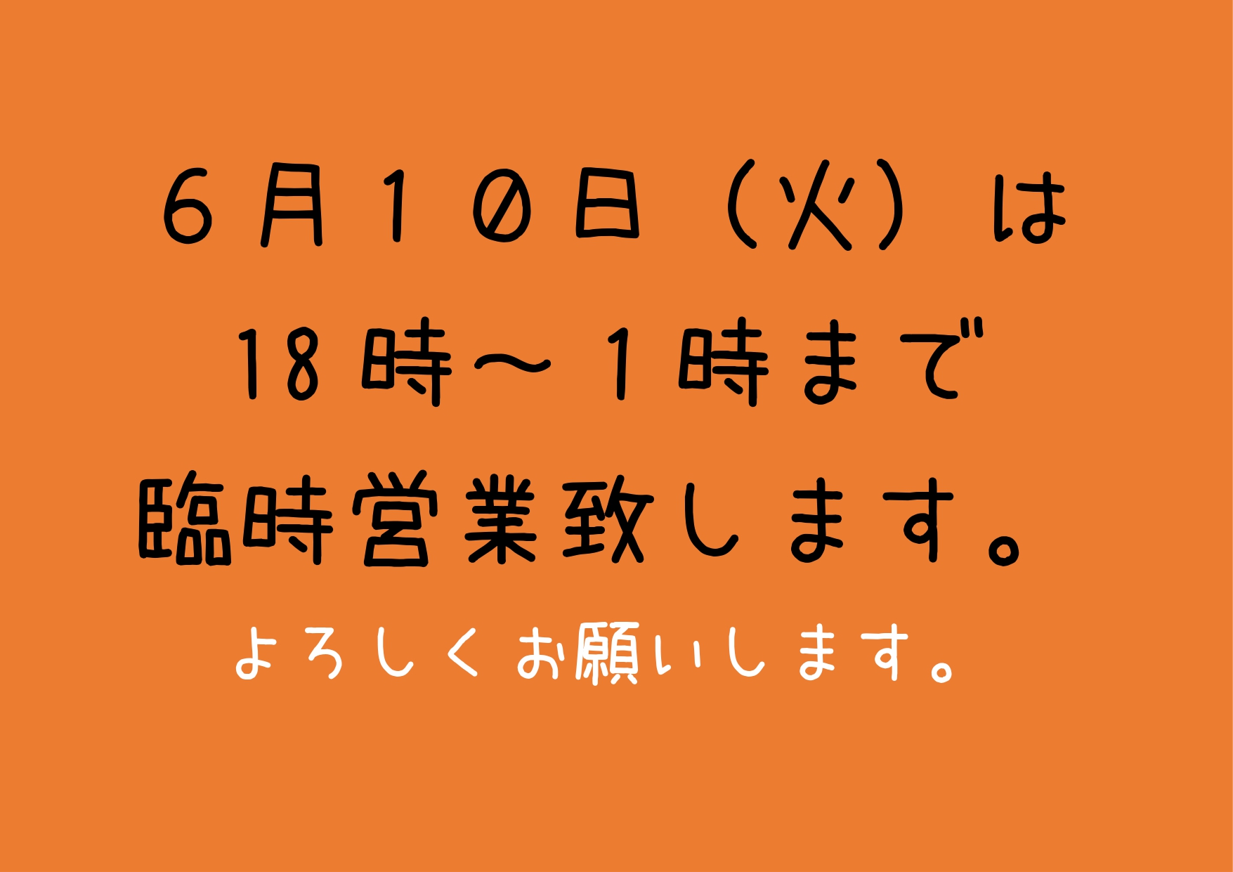 6/10(火)臨時営業のお知らせ 2025 6/07 お知らせ June 7, 2025 6月10日(火)は18時から1時まで臨時営業致します。 お知らせ 6/3(火)臨時営業のお知らせ 予約フォーム機能更新のお知らせ 関連記事 6/13(金)貸切営業のお知らせ June 10, 2025 本日6/9(月)臨時休業のお知らせ June 9, 2025 予約フォーム機能更新のお知らせ June 7, 2025 6/3(火)臨時営業のお知らせ June 2, 2025 オープンのお知らせ May 9, 2025