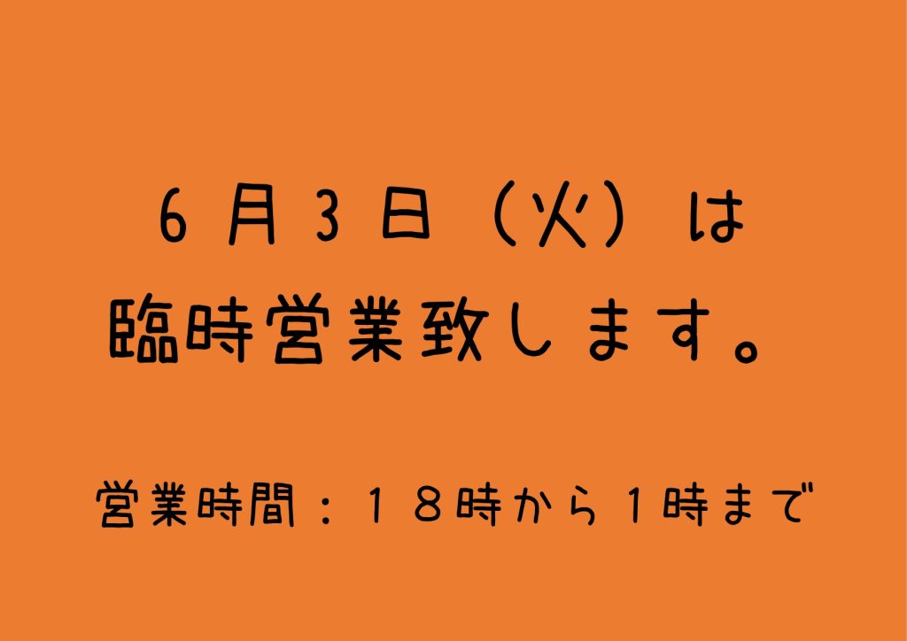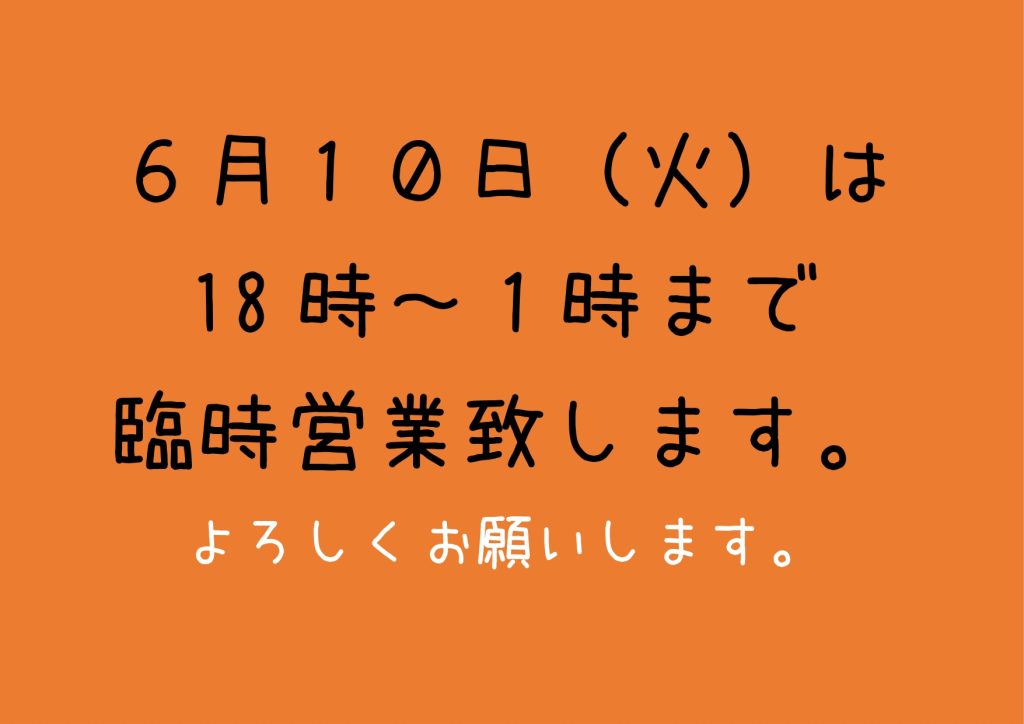 6月10日(火)は18時から1時まで臨時営業致します。 -